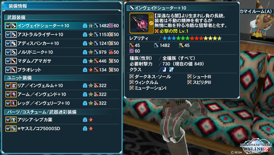 と言っても、このキャラはチャレンジやPSO2es等、8鯖外で活動することが多いので大して装備にこだわっていません。一応インヴェイドセットで固めていますが、それが役に立つことはあまりありませんね。
