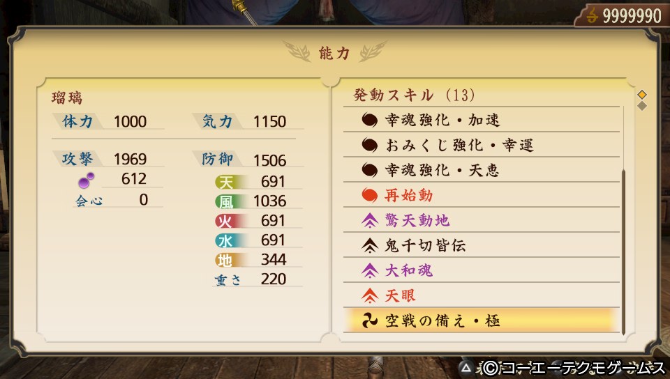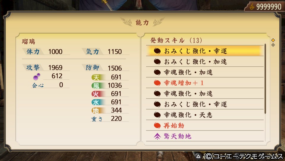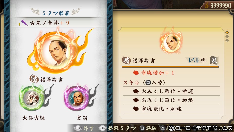 「福沢諭吉」「大谷吉継」「玄翁」で「おみくじ強化・幸運」×2「おみくじ強化・加速」「幸魂強化・加速」×2「幸魂増加+1」「幸魂強化・天恵」「再始動」「驚天動地」「鬼千切皆伝」「大和魂」「天眼」が発動しています。