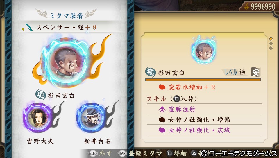 「杉田玄白」「吉野太夫」「荒井白石」で「霊脈注射」「女神ノ社強化・増幅」「女神ノ社強化・広域」「変若水増加+2」「女神ノ社強化・快癒」「武神ノ砦強化・増幅」「変若水短縮」「魂の絆」「大和魂」「女神ノ社短縮」「変若水強化・加速」「治癒増加+3」とおまけで「三つ揃い 安」が発動しています。
