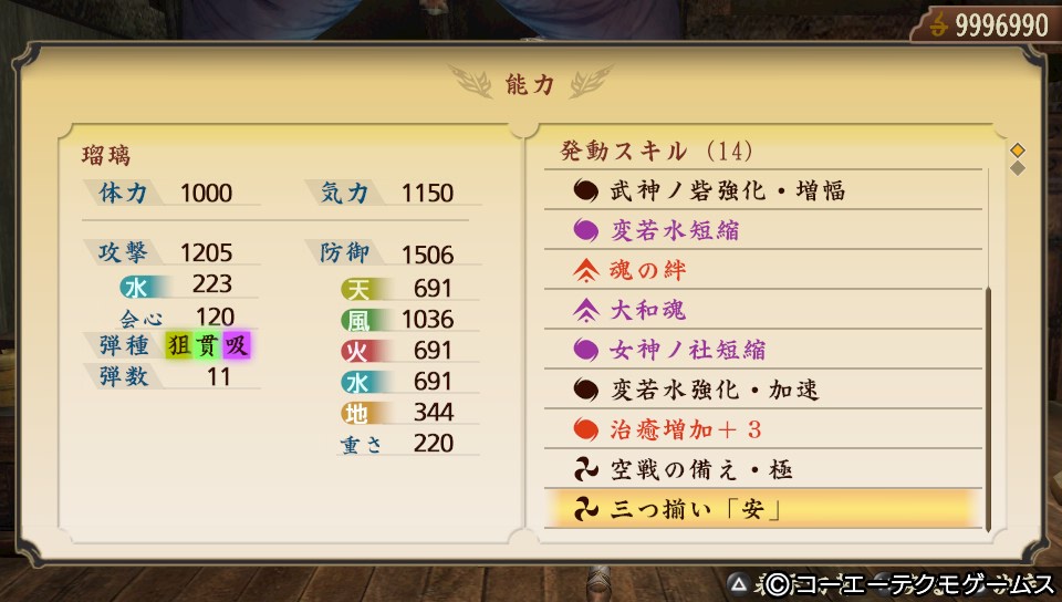 女神ノ社を強化するスキルとして増幅・広域・快癒を採用しており、加えて「女神ノ社短縮」も入っています。また変若水についても「変若水増加+2」と「変若水短縮」「変若水強化・加速」が入っているので、躊躇うことなく使用することができます。その他、おまけで付いてきた「三つ揃い 安」は封印状態を防止するものなので、肝心な時にタマフリが使用できないという可能性を0にしてくれます。