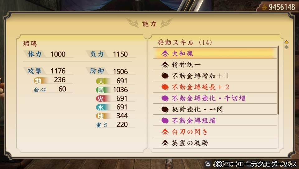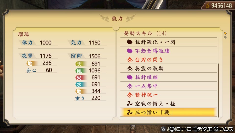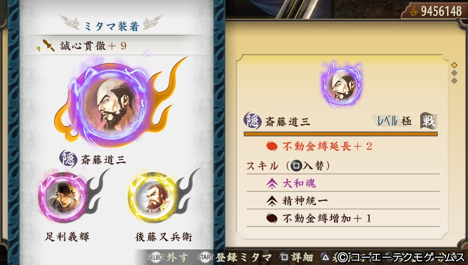 「斎藤道三」「足利義輝」「後藤又兵衛」で「大和魂」「精神統一」×2「不動金縛増加+1」「不動金縛延長+2」「不動金縛強化・千切増」「秘針強化・一閃」「不動金縛短縮」「白刃の閃き」「英霊の激励」「秘針短縮」「一点集中」とおまけで「三つ揃い 戦」が発動しています。
