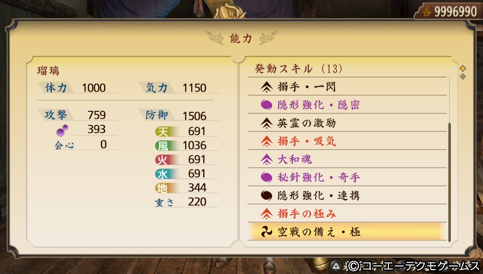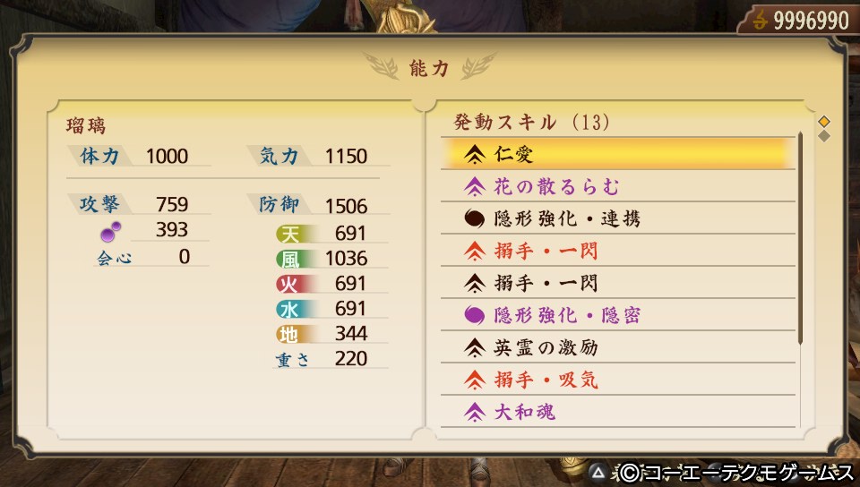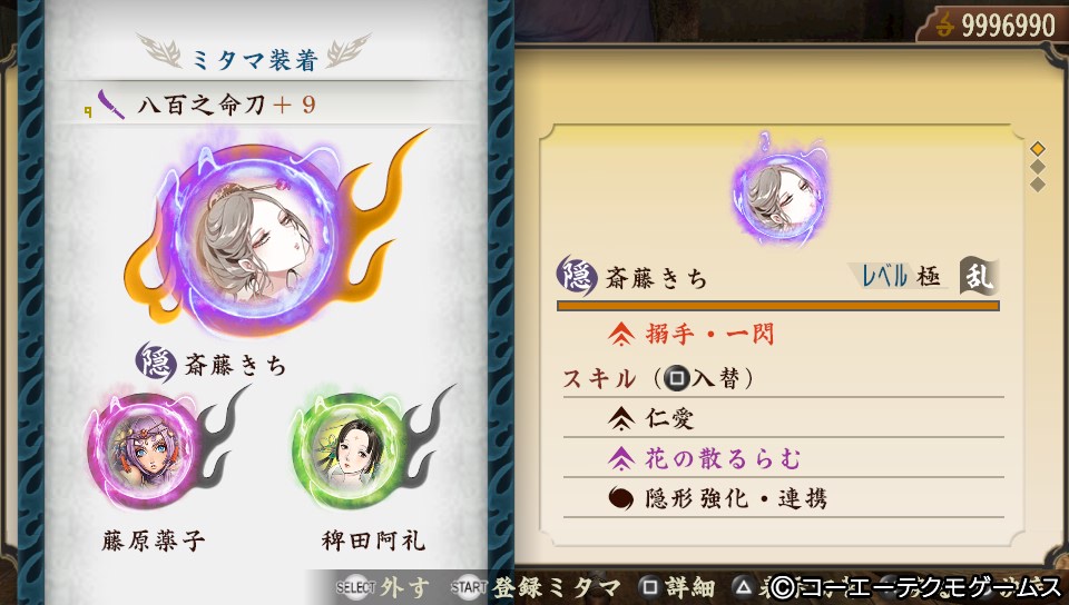 「斎藤きち」「藤原薬子」「稗田阿礼」で「仁愛」「花の散るらむ」「隠形強化・連携」×2「搦手・一閃」×2「隠形強化・隠密」「英霊の激励」「搦手・吸気」「大和魂」「秘針強化・奇手」「搦手の極み」が発動しています。