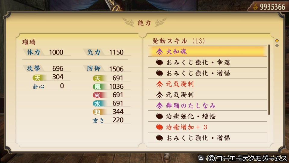 「アメノウズメ」「銀杏お藤」「十返舎一九」で「大和魂」「おみくじ強化・幸運」「おみくじ強化・増幅」×2「元気溌剌」×2「舞踊のたしなみ」「治癒強化・増幅」「治癒増加+3」「おみくじ強化・一閃」「おみくじ強化・奇跡」「英霊の加護」が発動しています。