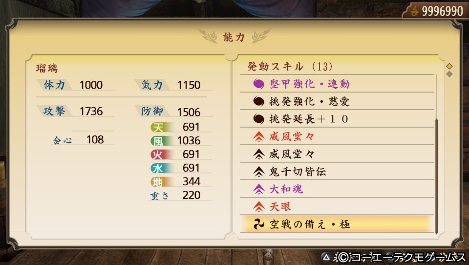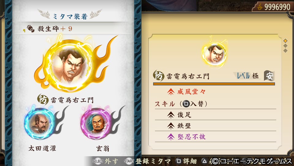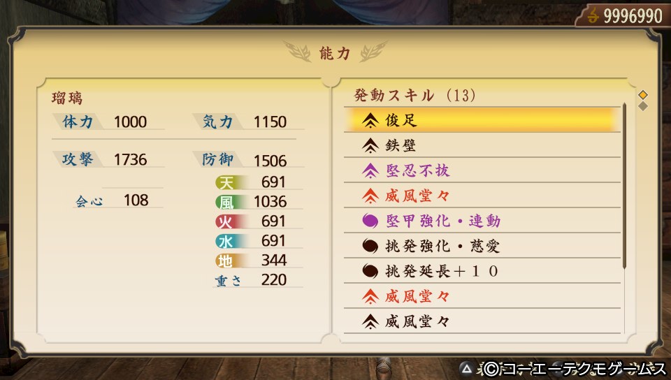 「雷電爲右エ門」「太田道灌」「玄翁」で「俊足」「鉄壁」「堅忍不抜」「威風堂々」×3「堅甲強化・連動」「挑発強化・慈愛」「挑発延長+10」「鬼千切皆伝」「大和魂」「天眼」が発動しています。
