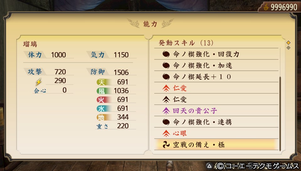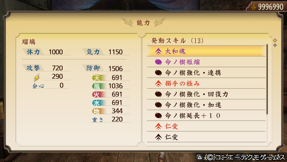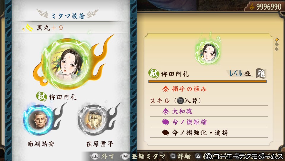 「稗田阿礼」「南淵請安」「在原業平」で「大和魂」「命ノ楔短縮」「命ノ楔強化・連携」×2「搦手の極み」「命ノ楔強化・回復力」「命ノ楔強化・加速」「命ノ楔延長+10」「仁愛」×2「回天の貴公子」「心眼」が発動しています。