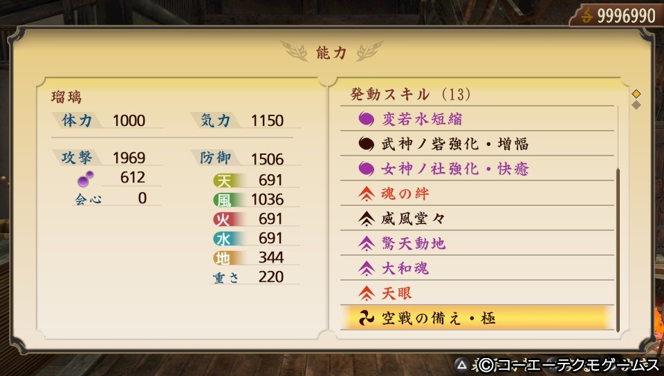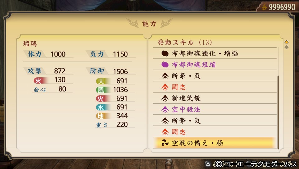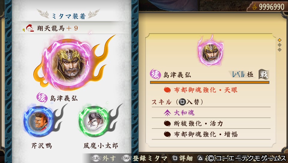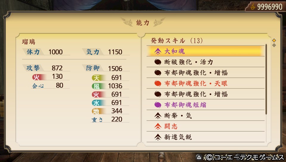 「島津義弘」「芹沢鴨」「風魔小太郎」で「大和魂」「断祓強化・活力」「布都御魂強化・増幅」×2「布都御魂強化・天眼」「布都御魂短縮」「断奪・気」×2「闘志」×2「新進気鋭」「空中殺法」が発動しています。