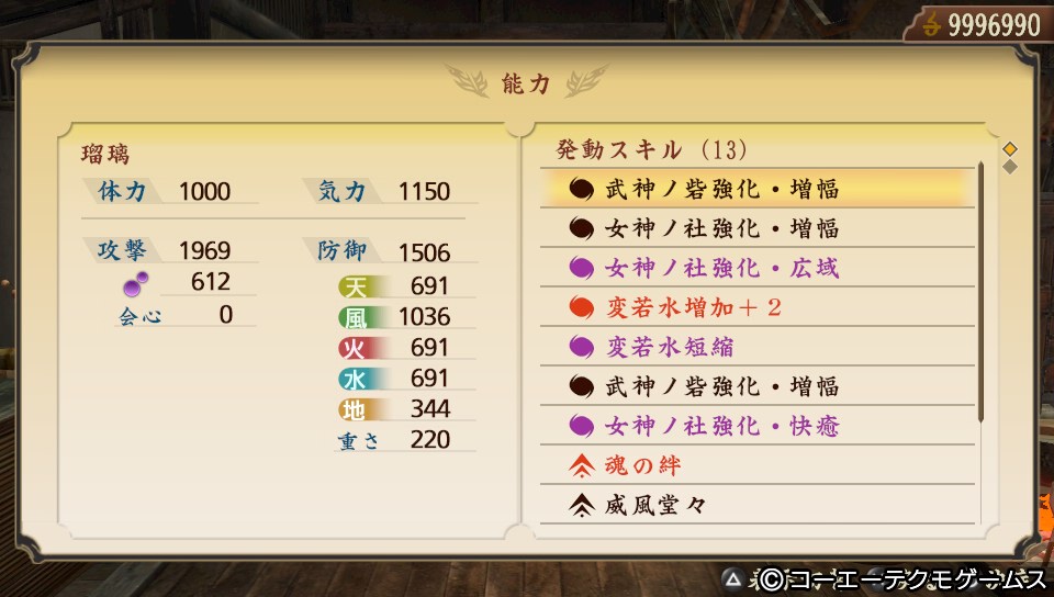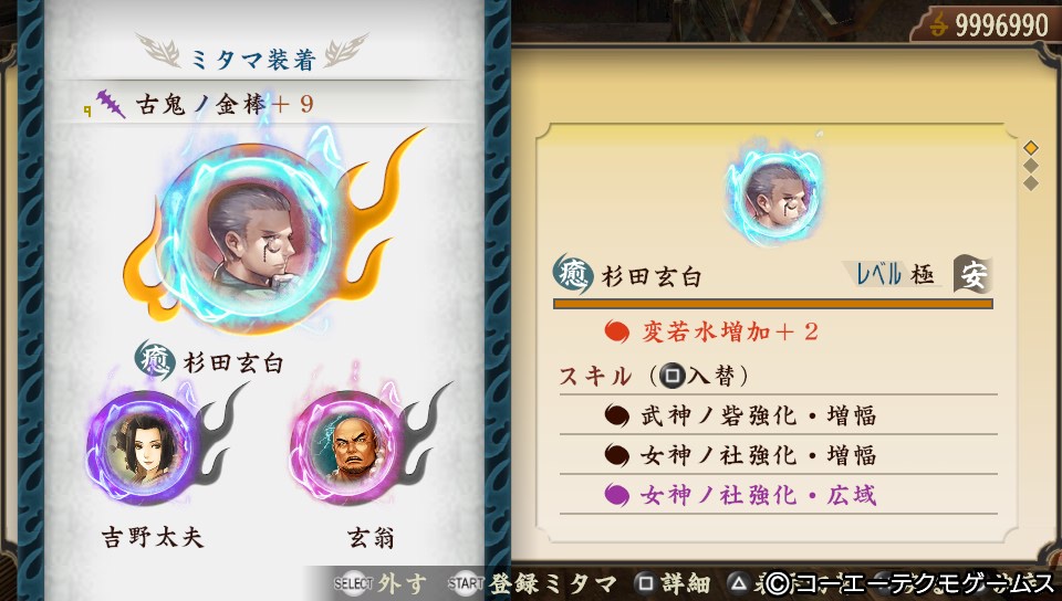「杉田玄白」「吉野太夫」「玄翁」で「武神ノ砦強化・増幅」×2「女神ノ社強化・増幅」「女神ノ社強化・広域」「変若水増加+2」「変若水短縮」「女神ノ社強化・快癒」「魂の絆」「威風堂々」「驚天動地」「大和魂」「天眼」が発動しています。