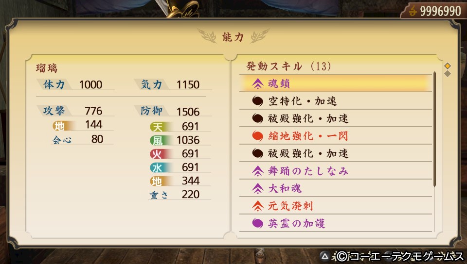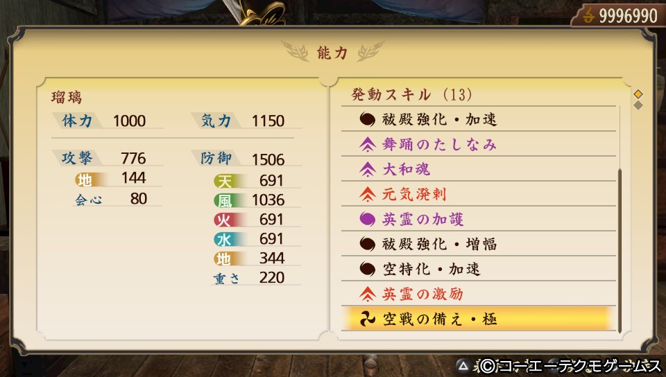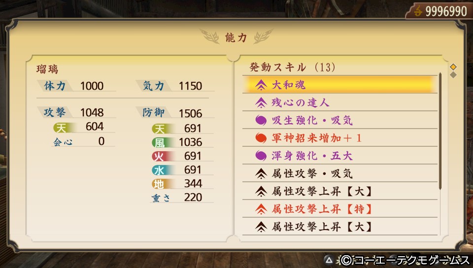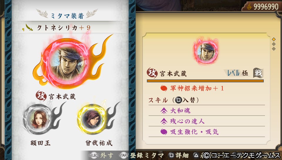 「宮本武蔵」「額田王」「曽我祐成」で「大和魂」「残心の達人」「吸生強化・吸気」「軍神招来増加+1」「渾身強化・五大」「属性攻撃・吸気」×2「属性攻撃上昇 大」×2「属性攻撃上昇 特」×2「攻撃力上昇 特」が発動しています。