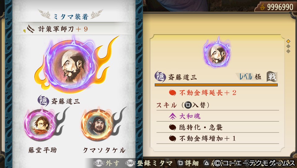 「斎藤道三」「藤堂平助」「クマソタケル」で「大和魂」「隠特化・急襲」×2「不動金縛増加+1」「不動金縛延長+2」「会心力上昇 大」×2「会心力上昇 特」×2「突破力」「闘志」×2が発動しています。