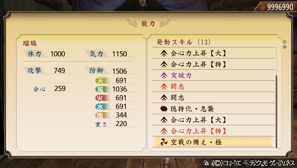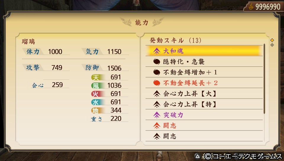 会心力上昇系スキルと「隠特化・急襲」×2によって、隠形の効果中や背後からの攻撃時の会心率が理論上100%になっているので、気力を気にせずに空中戦を仕掛けることができます。また、「不動金縛延長+2」で不動金縛を強化しているので、味方のサポートも行うことができます。