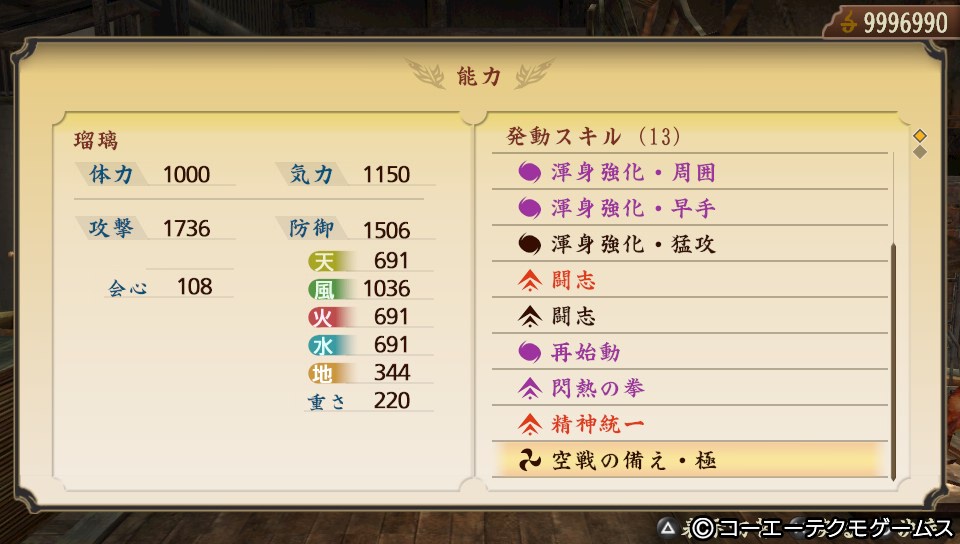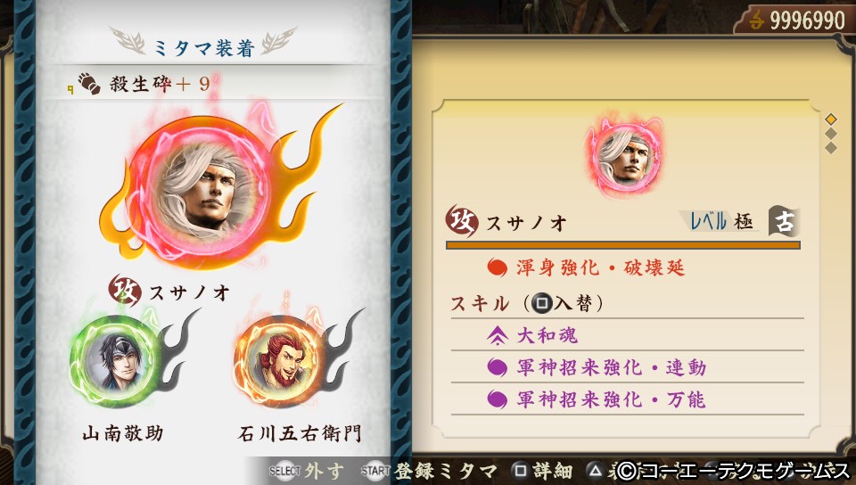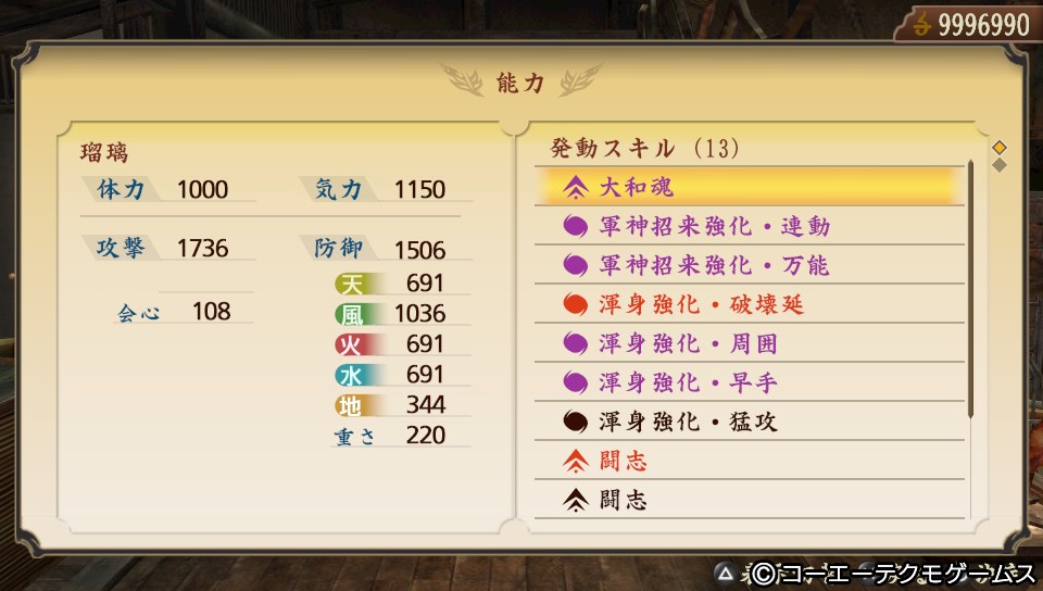 「スサノオ」「山南敬助」「石川五右衛門」で「大和魂」「軍神招来強化・連動」「軍神招来強化・万能」「渾身強化・破壊延」「渾身強化・周囲」「渾身強化・早手」「渾身強化・猛攻」「闘志」×2「再始動」「閃熱の拳」「精神統一」が発動しています。
