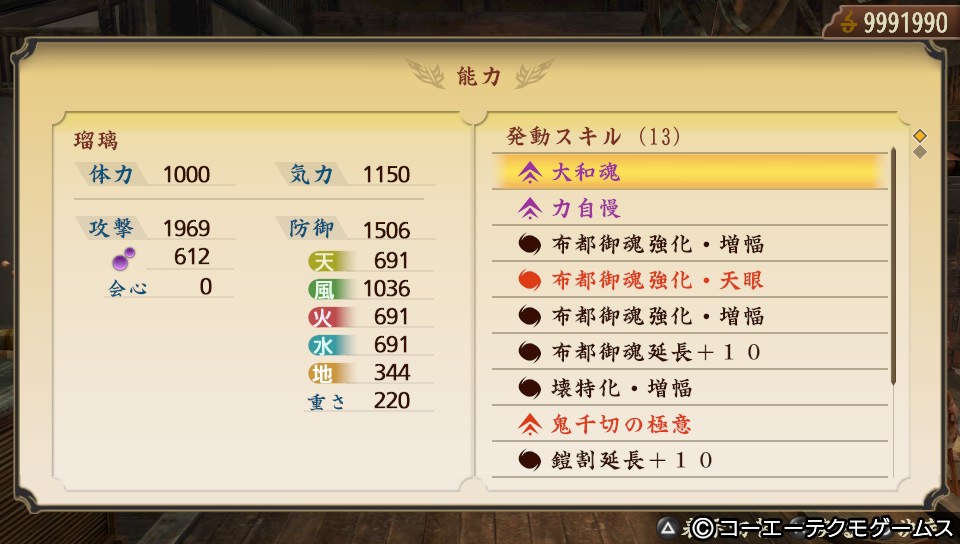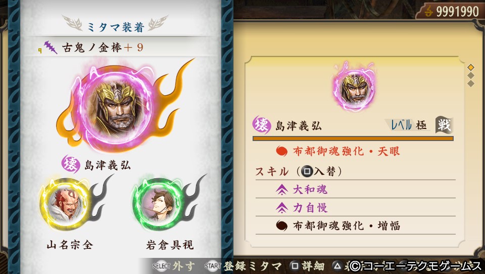 「島津義弘」「山名宗全」「岩倉具視」で「大和魂」「力自慢」「布都御魂強化・増幅」×2「布都御魂強化・天眼」「布都御魂延長+10」「壊特化・増幅」×2「鬼千切の極意」「兜割延長+10」「壊特化・延長」「魂の絆」が発動しています。