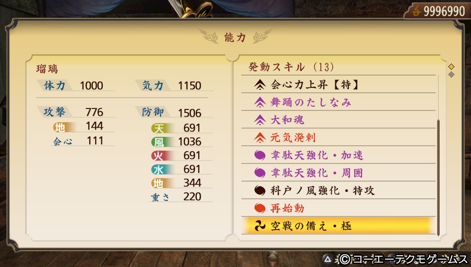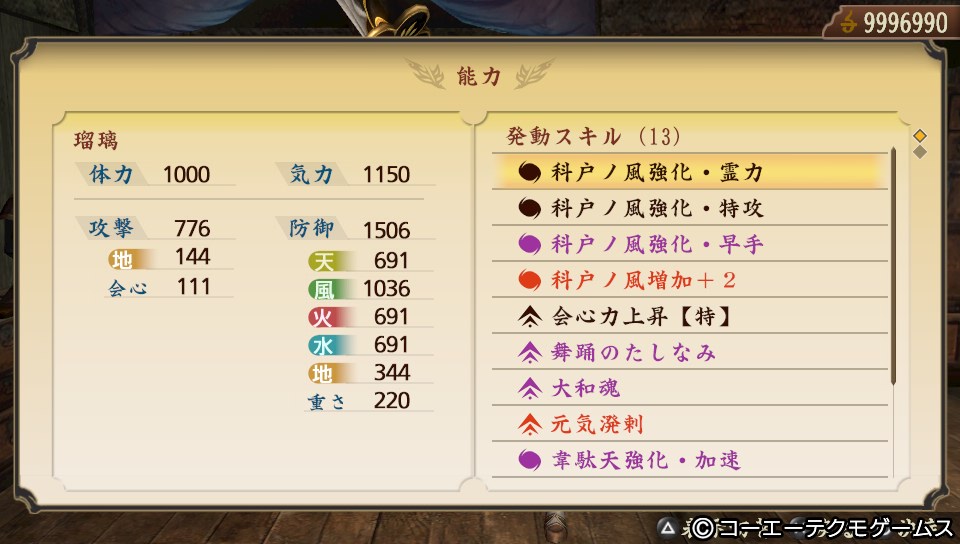 「長宗我部元親」「アメノウズメ」「松平信綱」で「科戸ノ風強化・霊力」「科戸ノ風強化・特攻」×2「科戸ノ風強化・早手」「科戸ノ風増加+2」「会心力上昇 特」「舞踊のたしなみ」「大和魂」「元気溌剌」「韋駄天強化・加速」「韋駄天強化・周囲」「再始動」が発動しています。