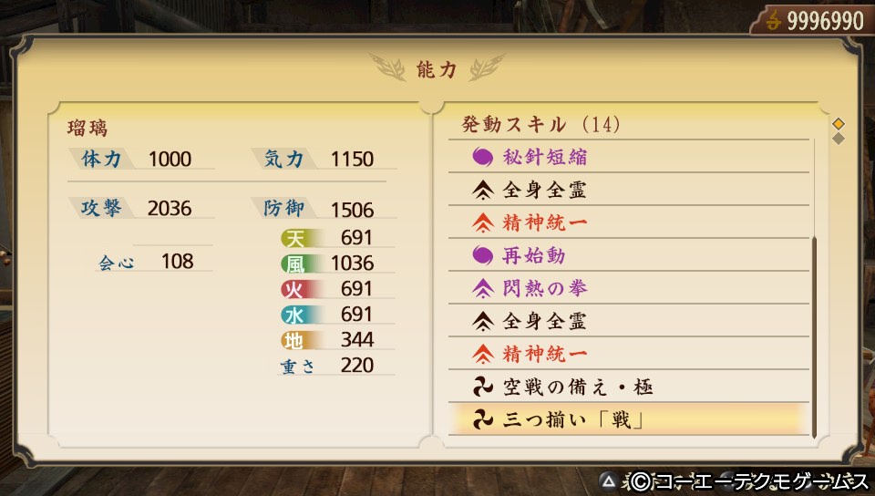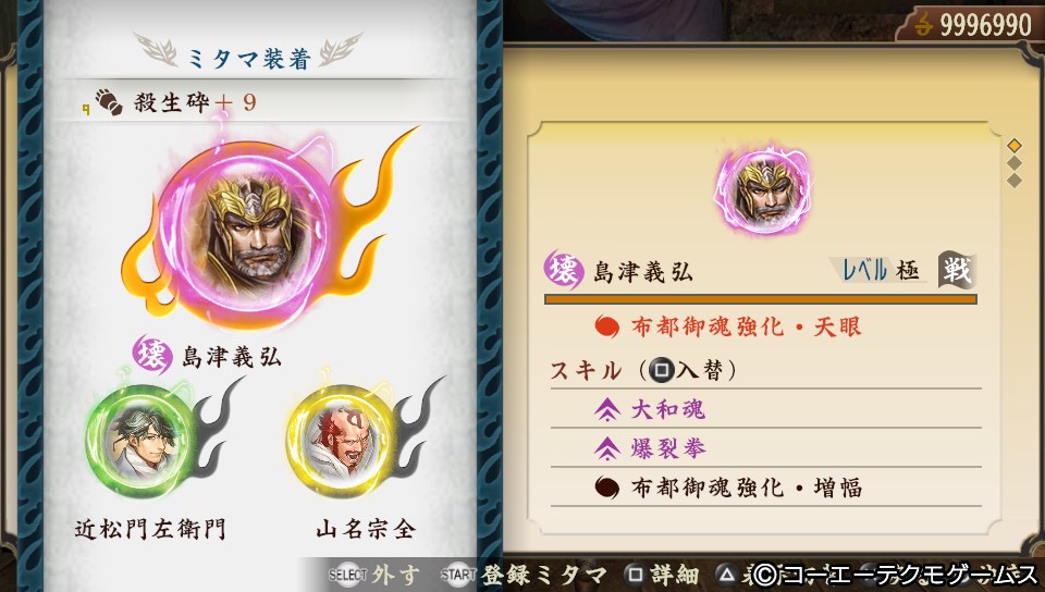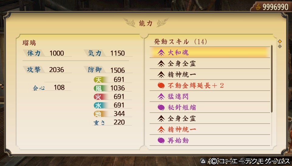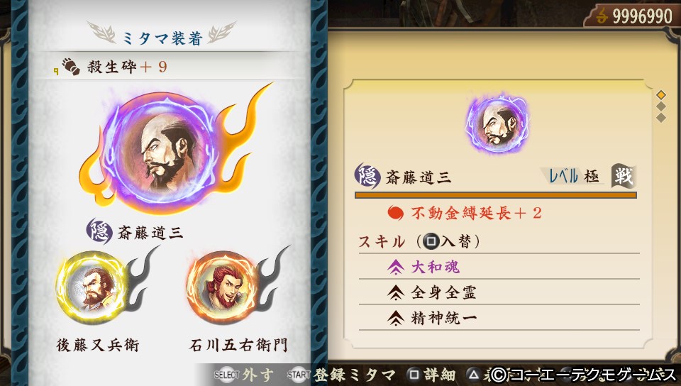 「斎藤道三」「後藤又兵衛」「石川五右衛門」で「大和魂」「全身全霊」×3「精神統一」×3「不動金縛延長+2」「猛進閃」「秘針短縮」「再始動」「閃熱の拳」とおまけで「三つ揃い 戦」が発動しています。