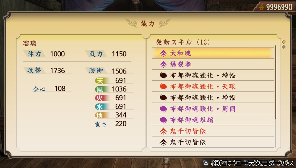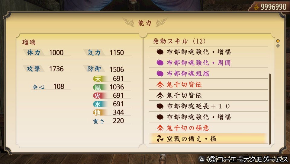 「島津義弘」「近松門左衛門」「山名宗全」で「大和魂」「爆裂拳」「布都御魂強化・増幅」×3「布都御魂強化・天眼」「布都御魂強化・周囲」「布都御魂短縮」「鬼千切皆伝」×2「布都御魂延長+10」「鬼千切の極意」が発動しています。