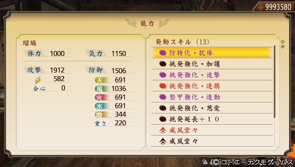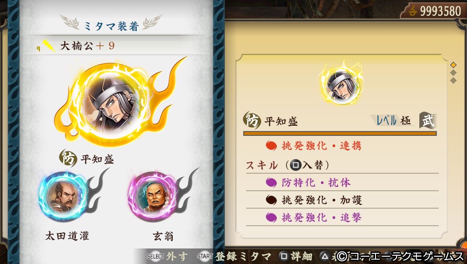 「平知盛」「太田道灌」「玄翁」で「防特化・抗体」「挑発強化・加護」「挑発強化・追撃」「挑発強化・連携」「堅甲強化・連動」「挑発強化・慈愛」「挑発延長+10」「威風堂々」×2
